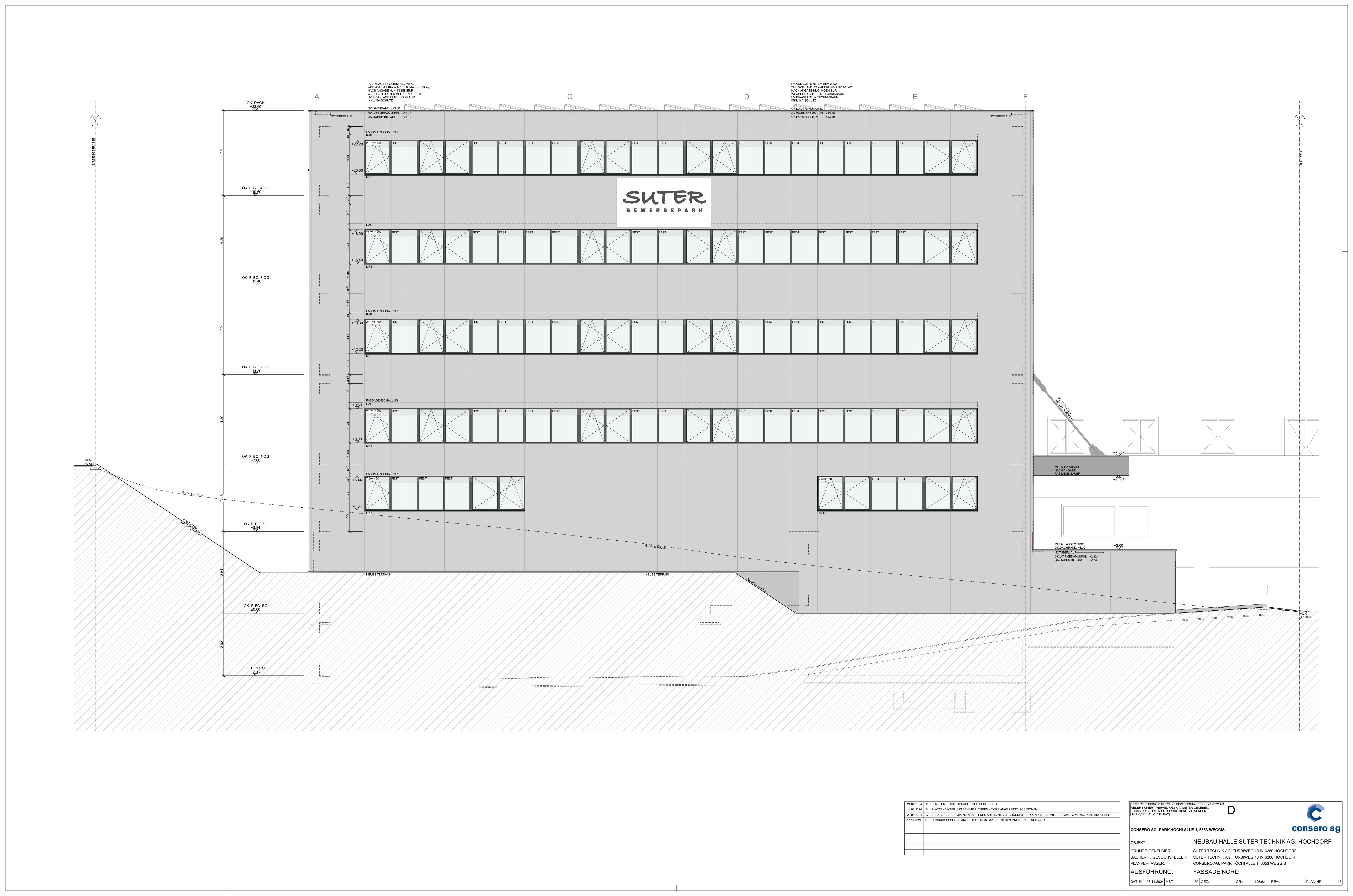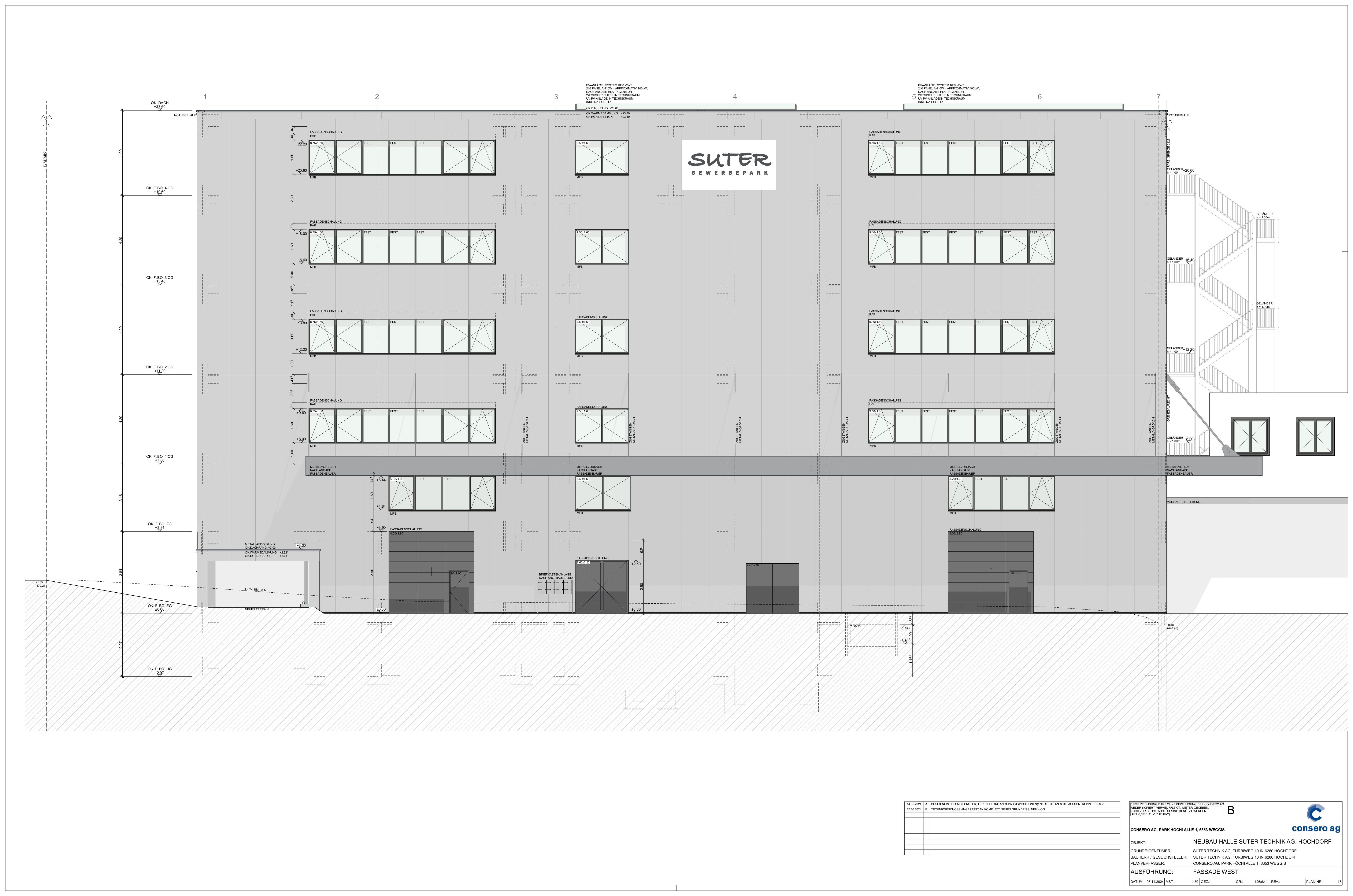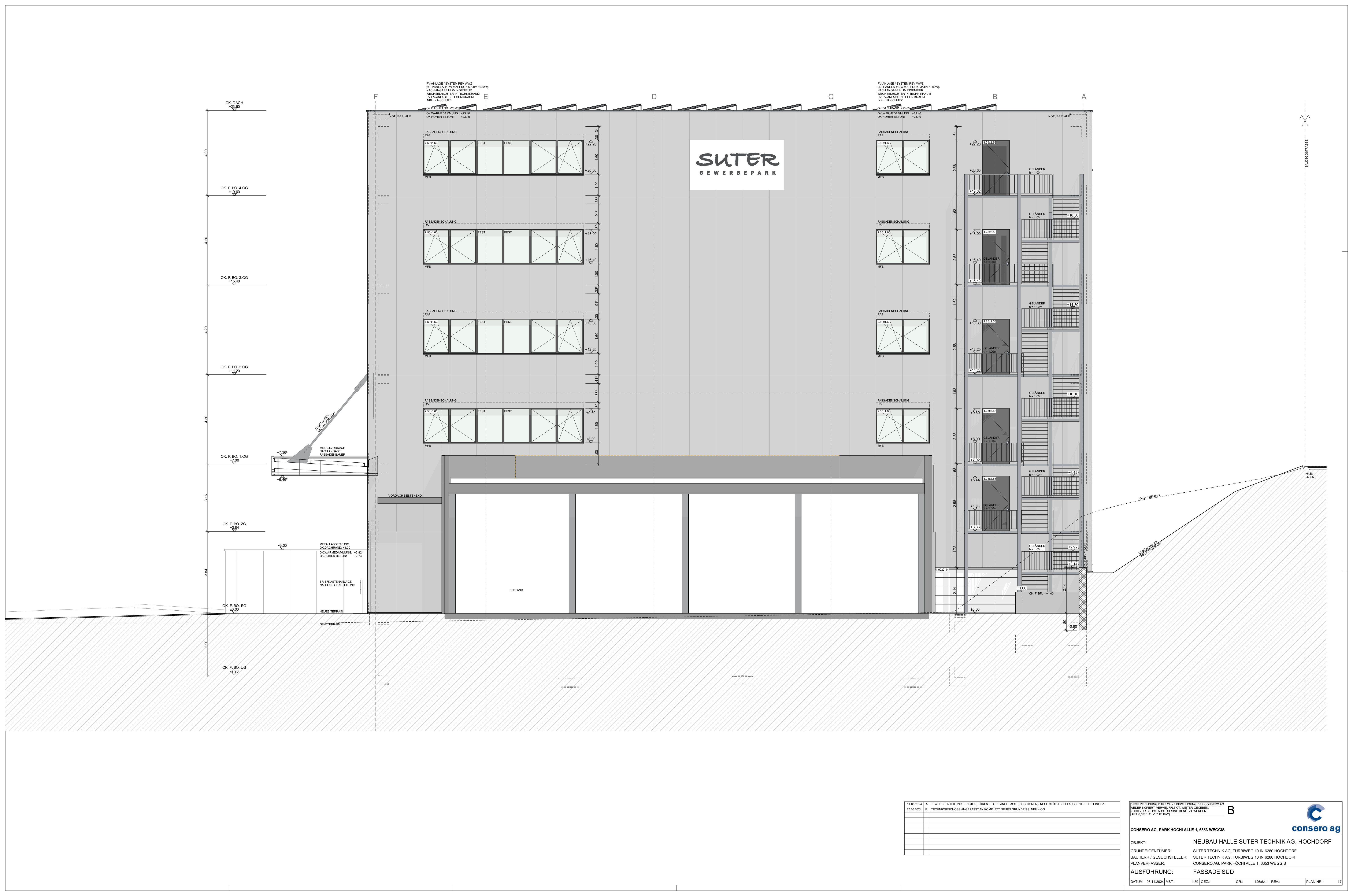 Der Suter Gewerbepark überzeugt durch eine durchdachte Architektur und eine klare Gestaltung. Die folgenden Pläne geben einen Überblick über die Fassaden, den Gebäudeaufbau und die Umgebung mit Zufahrten, Rampen und Parkflächen.