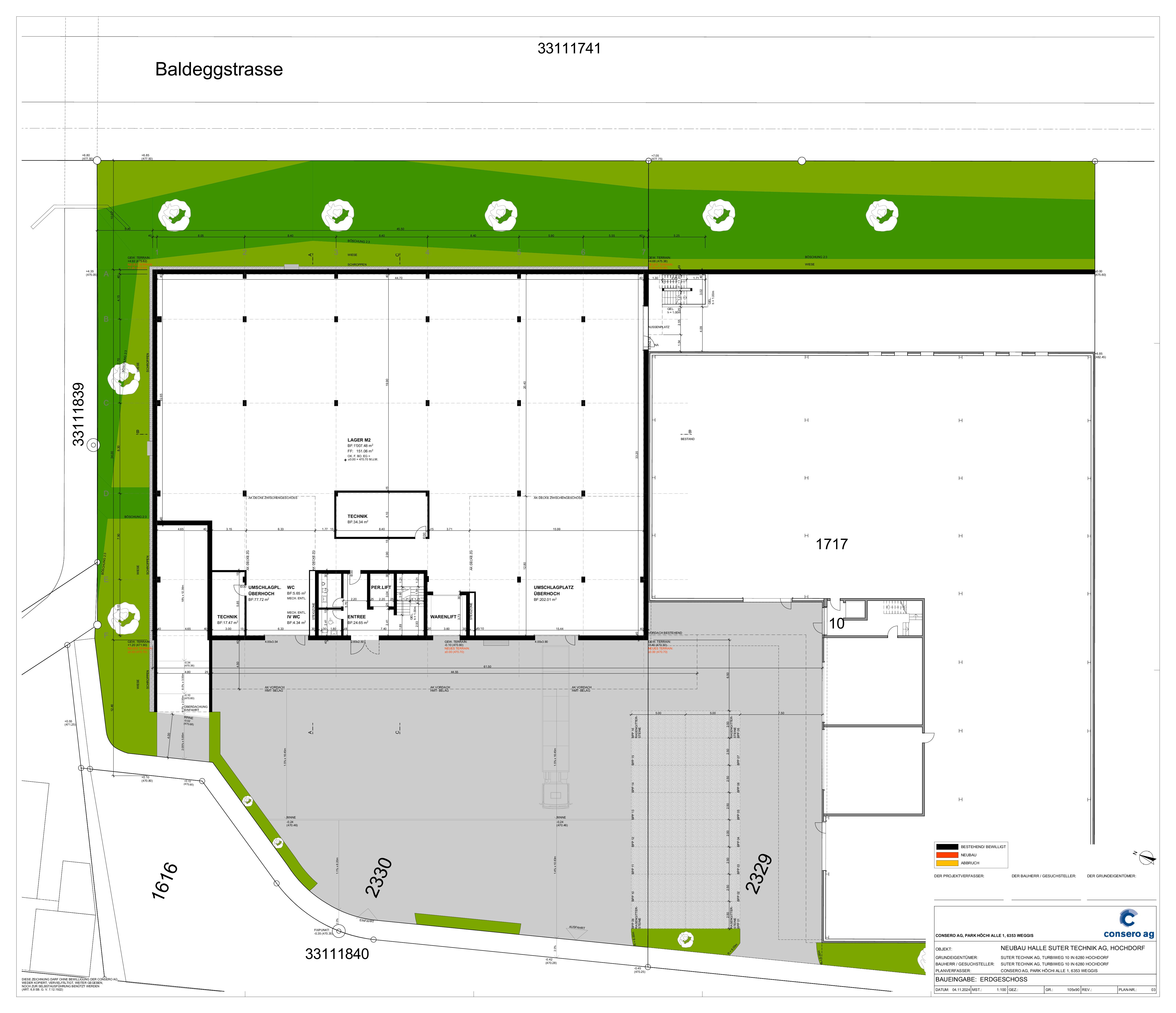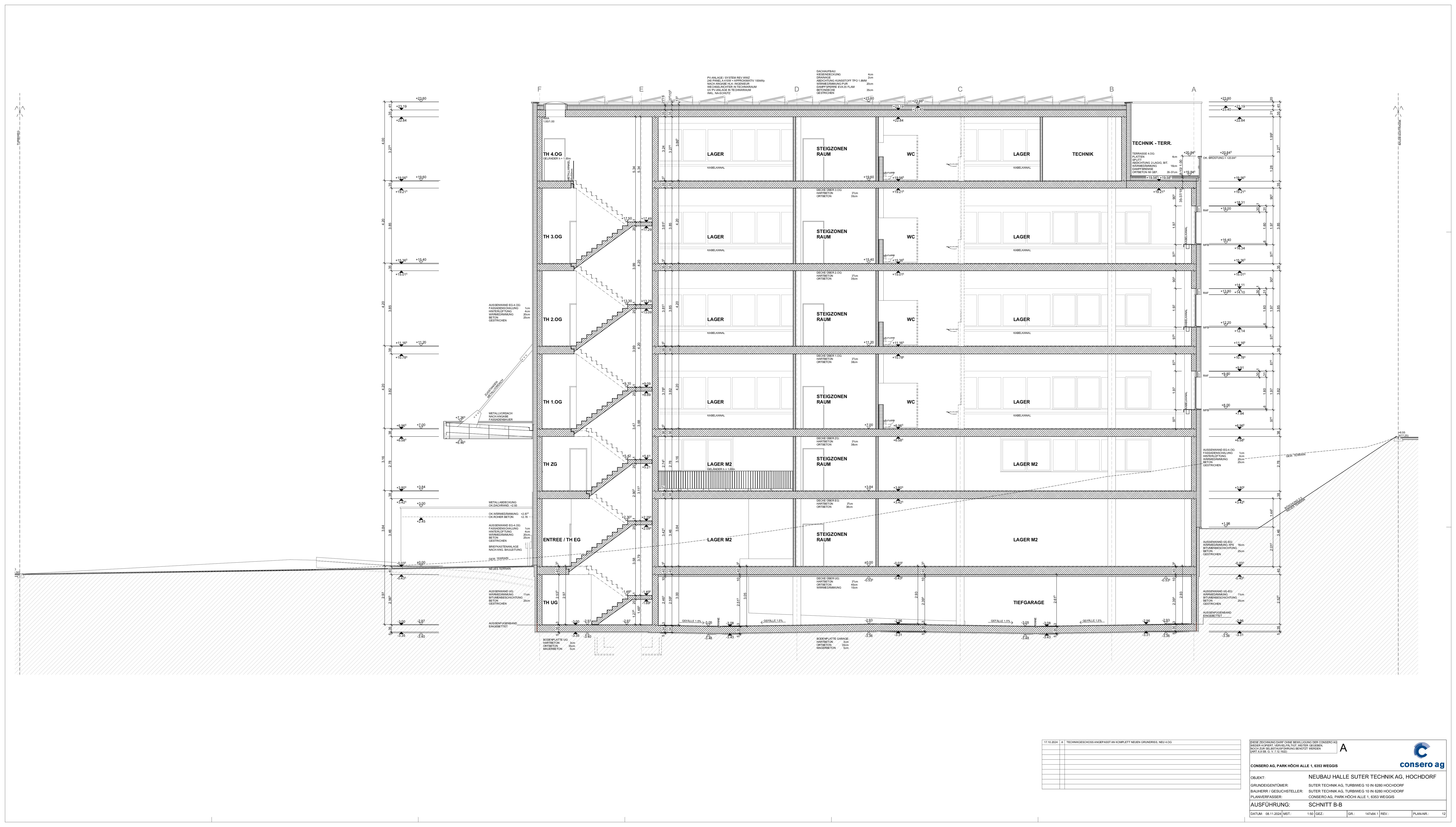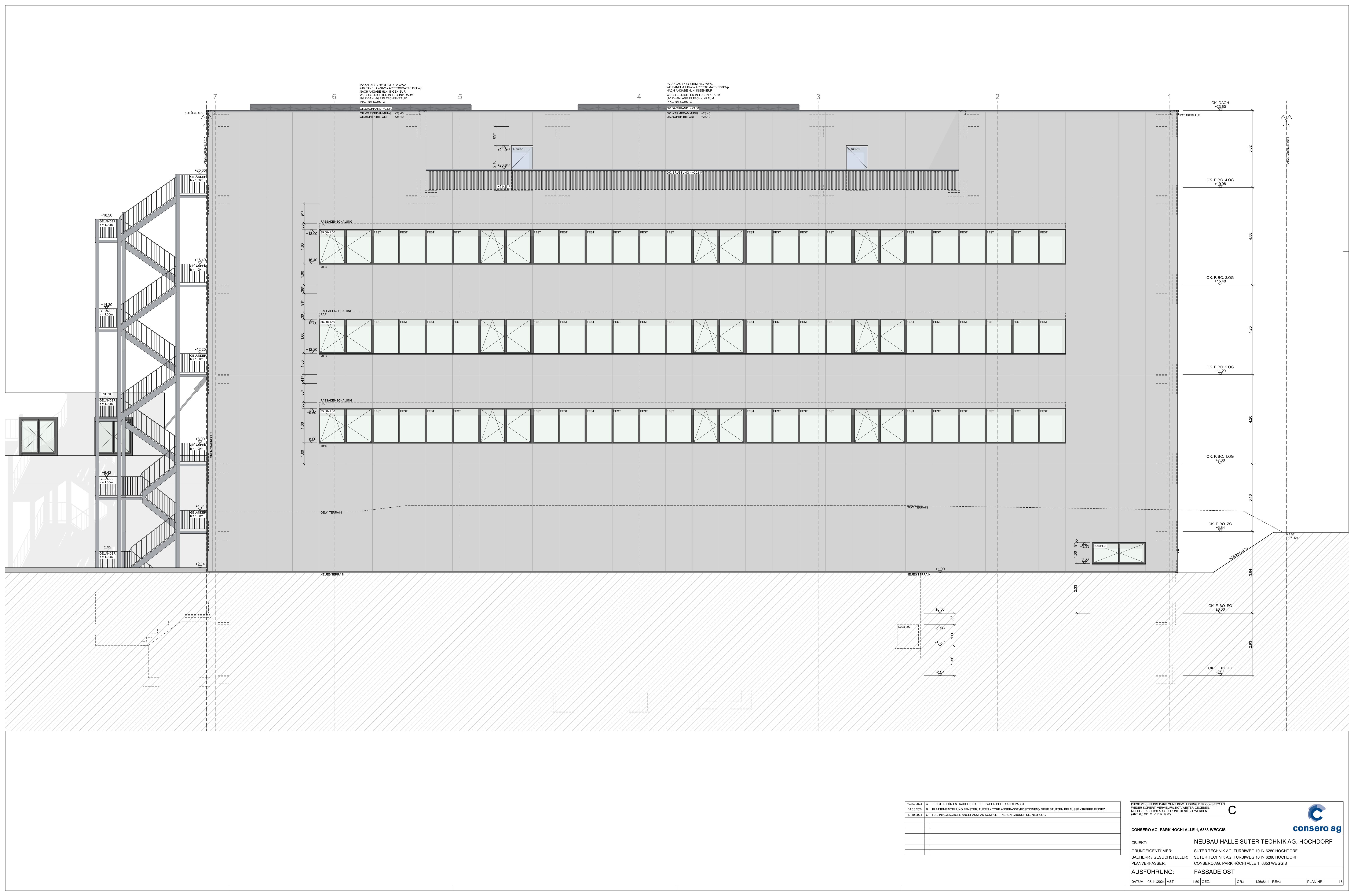 Der Suter Gewerbepark überzeugt durch eine durchdachte Architektur und eine klare Gestaltung. Die folgenden Pläne geben einen Überblick über die Fassaden, den Gebäudeaufbau und die Umgebung mit Zufahrten, Rampen und Parkflächen.